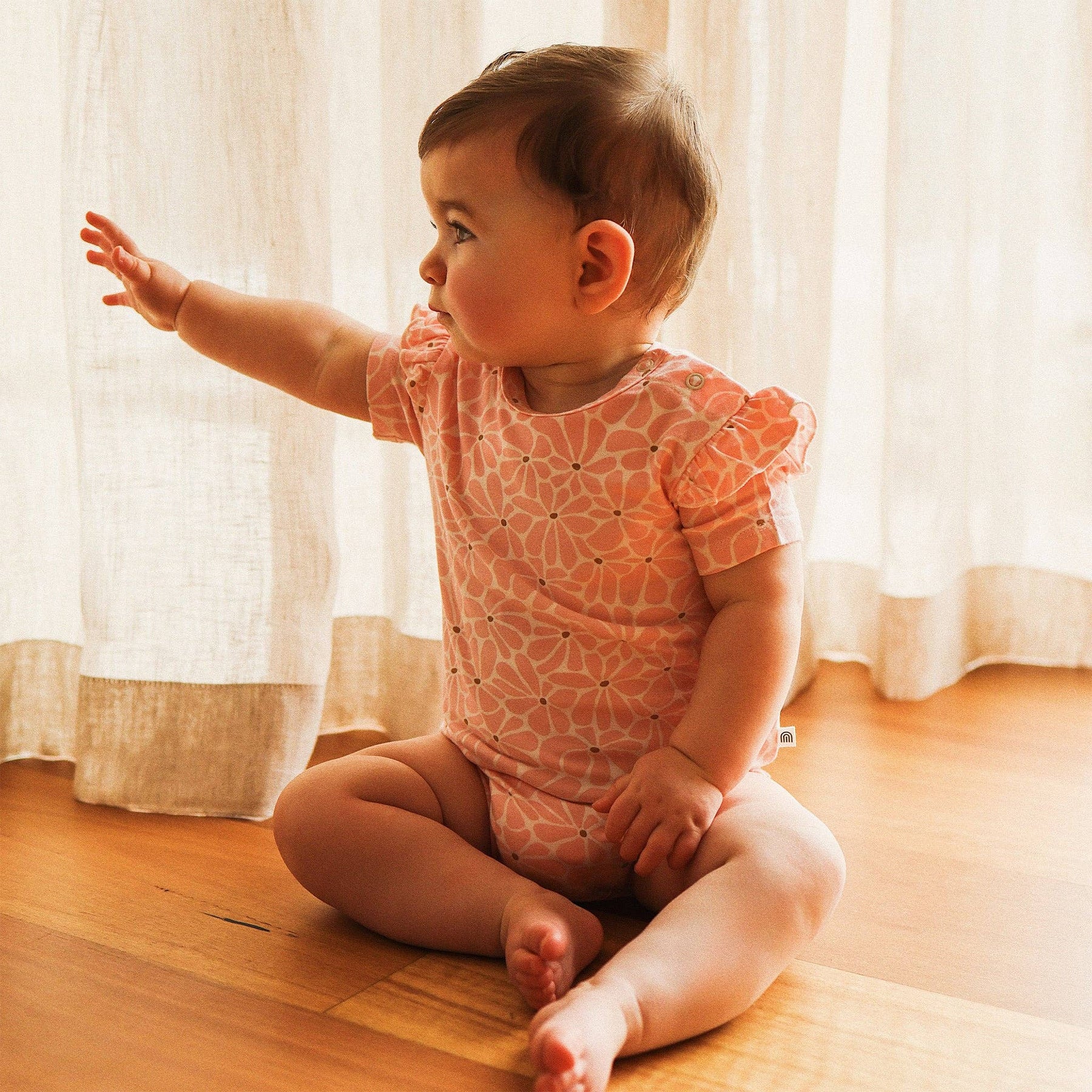 Our Frill Sleeve Bodysuit is crafted from sustainable viscose elastane for soft stretch and all-day comfort. Featuring sweet shoulder frills and convenient crotch snaps, it makes dressing and changing effortless. Breathable, easy to wash, and versatile - it's perfect for everyday wear and active adventures!