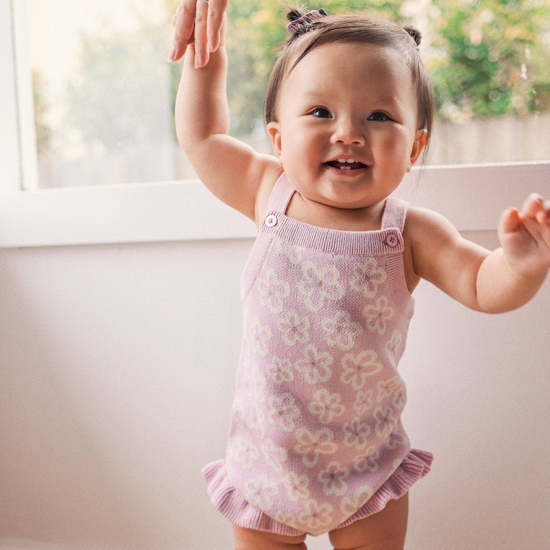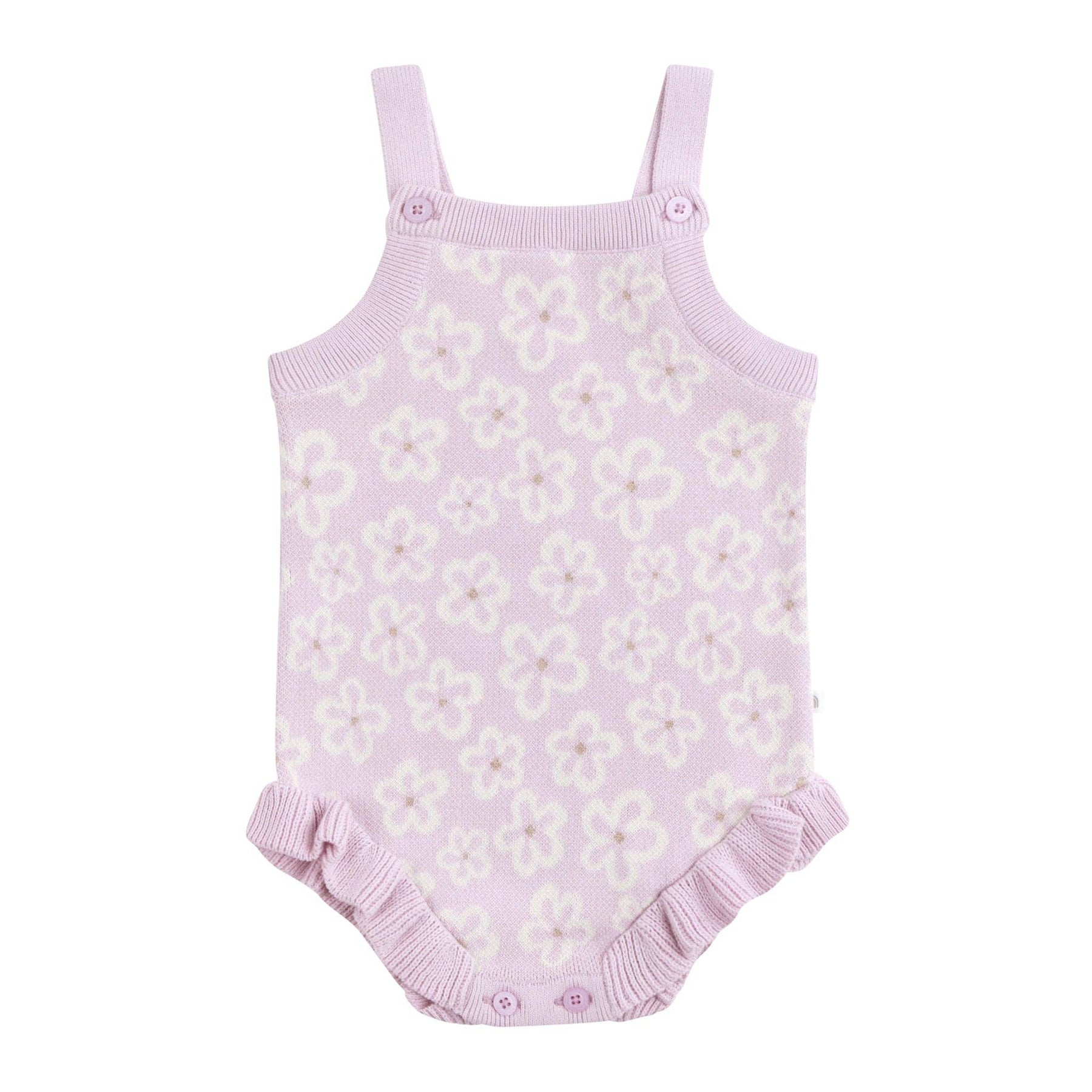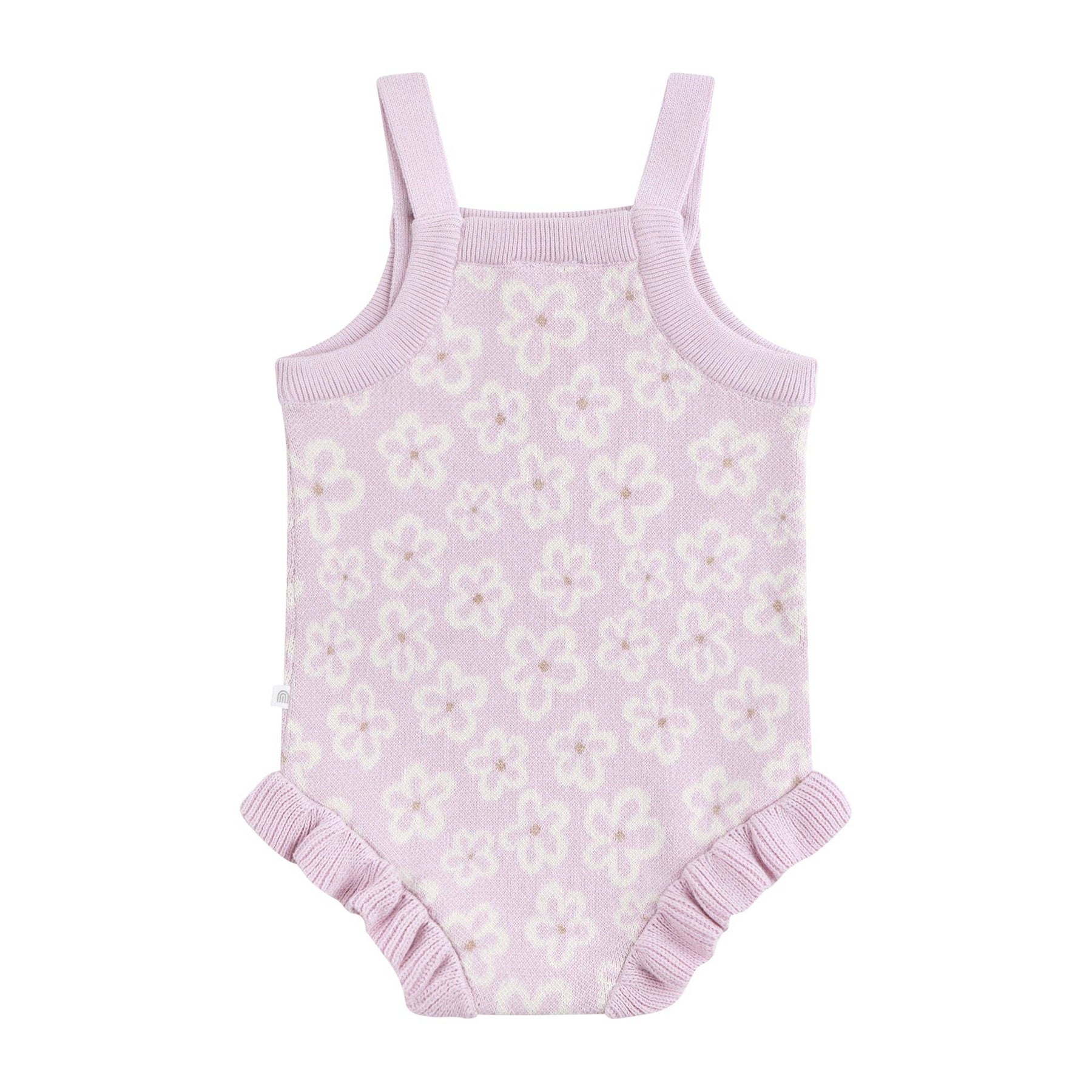 Our beautiful Knit Frill Romper, with its timeless design, effortlessly blends style and comfort. This gorgeous piece showcases a sweet flower design with a frill at the leg. Style it solo, or layer it lightly to create your little one's summer look.