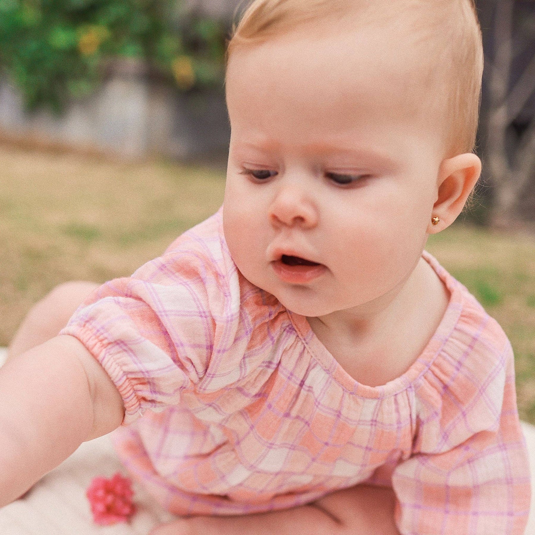 Key Features * 100% Cotton Check * Puffed bubble short sleeves * Centre back pearl buttons for easy changes * Fits true to size