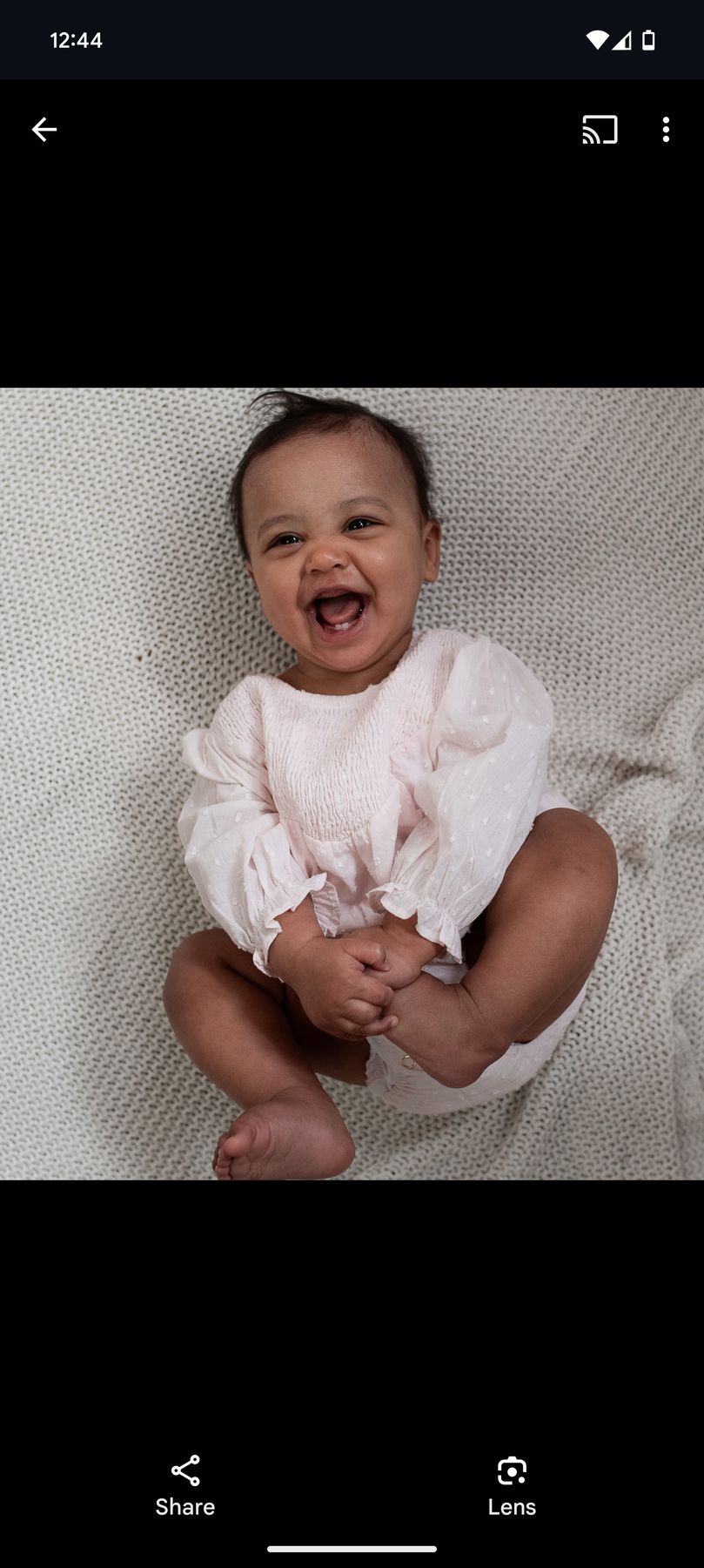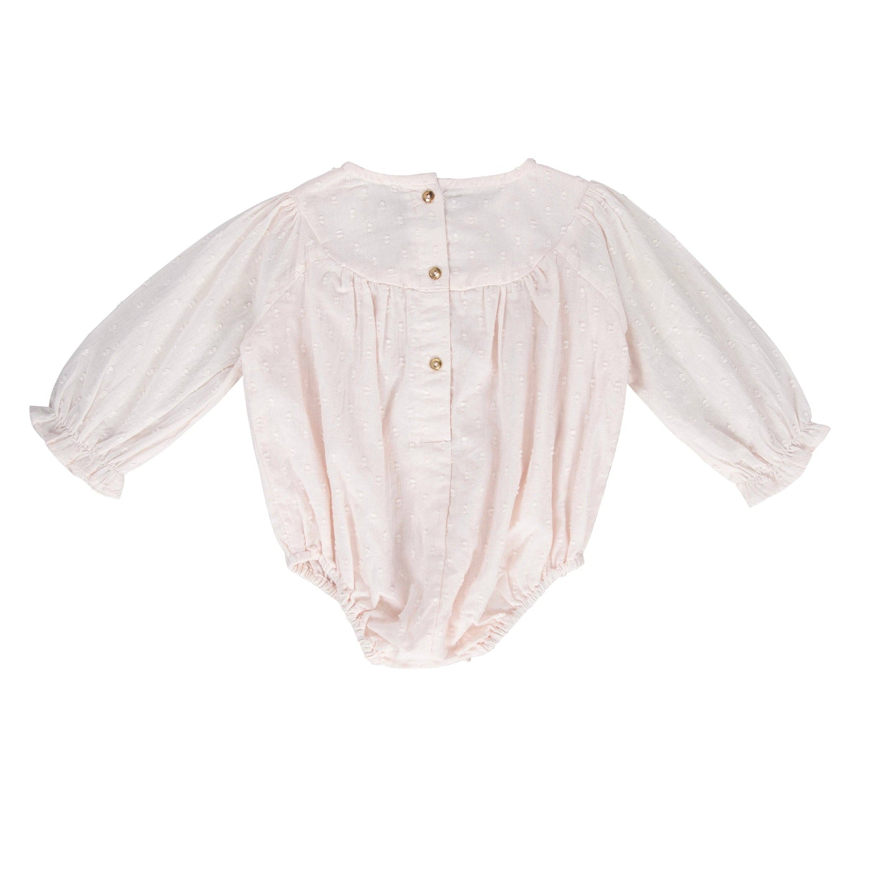 Tiny frill at neck, gold buttons down the back, tiny frill on sleeve at wrist. Full sleeve.