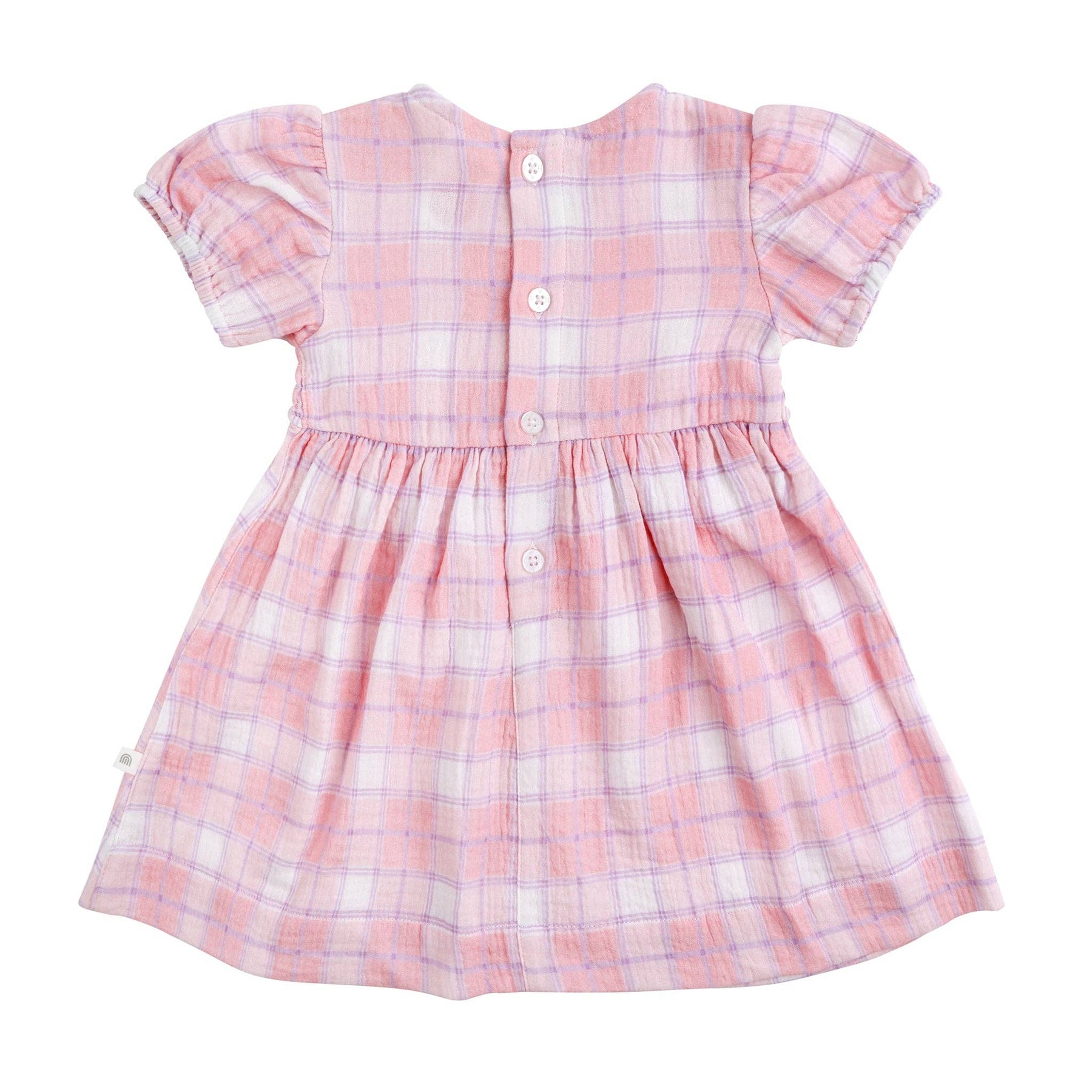 Key Features: * 100% Organic Cotton * Shirred bodice detailing * Sweet puffed short sleeves * Pink check pattern * Centre back buttons for easy dressing * Fits true to size