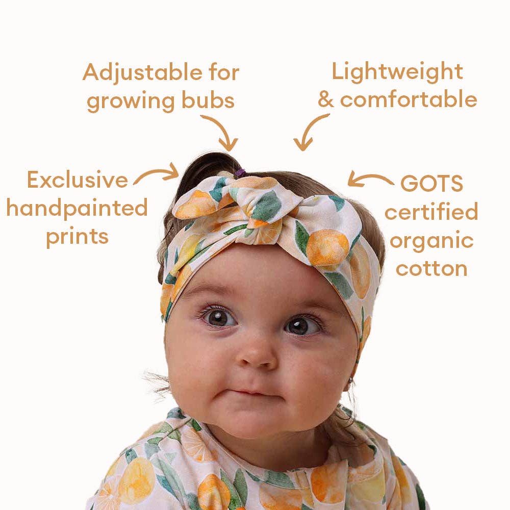 Our organic cotton Sunny Citrus topknot is made with GOTS Certified Organic Cotton CU 1182228.
